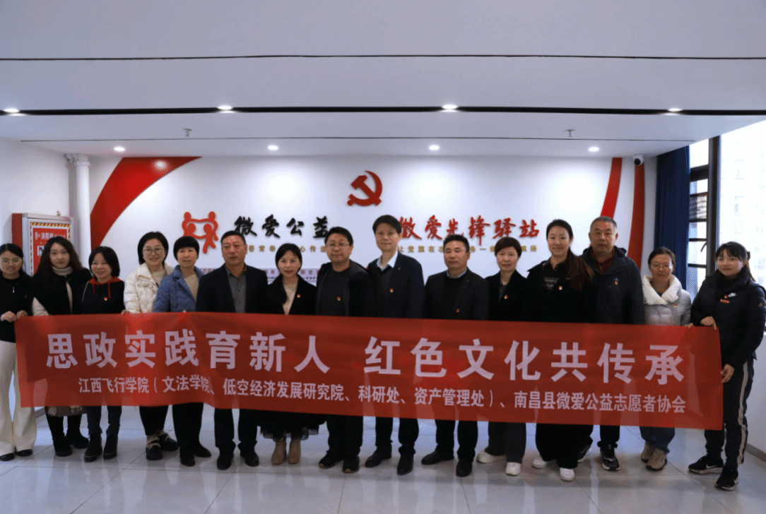 12月17日,江西飞行学院文法学院、低空经济发展研究院联合科研处、资产管理处,组织教工党支部与学生党支部、航空文化协会、赣文化交流协会与青年普法协会、红色故事英语宣讲队师生代表与红色班级成员,前往南昌县微爱公益志愿者协会举行“大思政课”实践教育基地揭牌仪式。