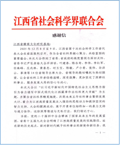 近日,江西省赣商文化研究基地收到江西省社会科学界联合会发来的感谢信。基地将以此为契机,在江西省社联、校党委、校行政的坚强领导下,在校科研处的大力支持下,深入推进研究工作,积极履行职责、砥砺前行,持续为江西社科事业的高质量发展贡献力量。