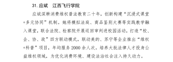 此次荣誉的获得,既是对应斌老师二十年来深耕消费维权普法教育、默默奉献的高度肯定,也彰显了江西飞行学院一直以来坚持立德树人根本任务、深耕法治育人与社会服务的责任担当。